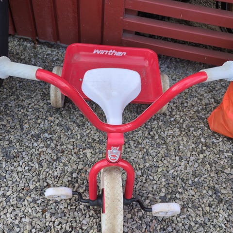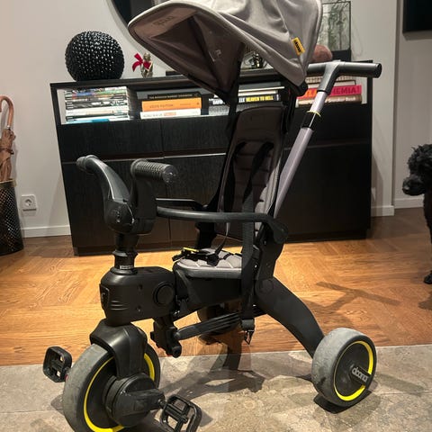 Fin trehjuling med solskydd och ett höjbart tandtag som man kan hålla i och svänga med
