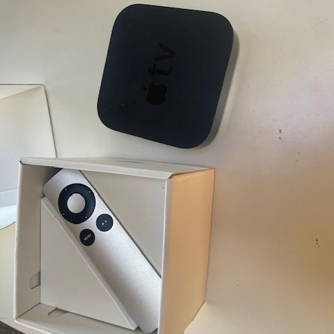 Apple TV mediaspelare i svart färg med medföljande fjärrkontroll i silver. Enheten ansluts till TV via HDMI (ingår ej) och ström via nätkabel. Lämplig för uppspelning av digitalt innehåll till TV från kompatibla Apple-enheter. Generation 3 (A1469). Fungerar vid test.