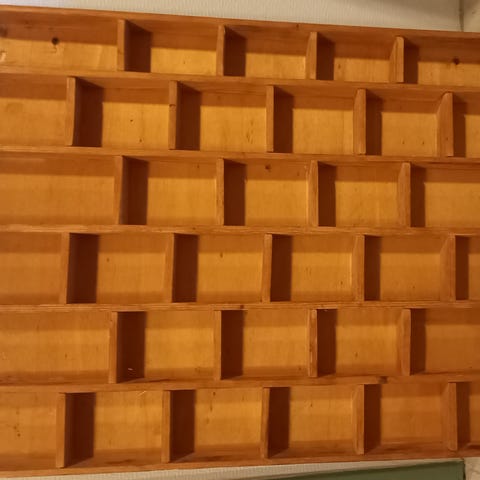 Kasthyllor = Trälåda med många små fack i olika storlekar. 70 x 50 cm. Finns för avhämtning i Huddinge Centrum. Lådan är rektangulär och kan användas till förvaring eller sortering av småsaker, exempelvis pysselmaterial, skruvar eller samlarföremål. Trälådan kan ställas på golv eller hylla, eller eventuellt hängas på vägg om man monterar upphängning på baksidan.