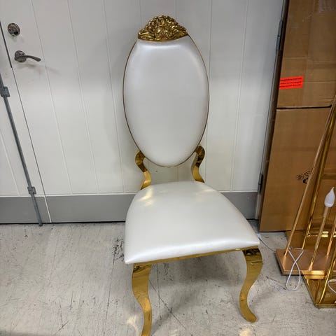 Brudparsstol i vit klädsel med guldfärgade ben och dekorativa detaljer. Stolen har hög, oval rygg med utsmyckning upptill och på baksidan. Sits och rygg är stoppade för bekväm sittställning. Passar bra till bröllop. Finns 4 stycken.