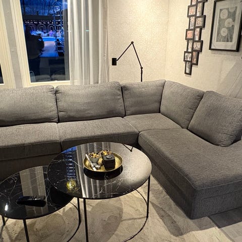 Länk till soffa dock ej samma färg. Min är mörk grå/svart.