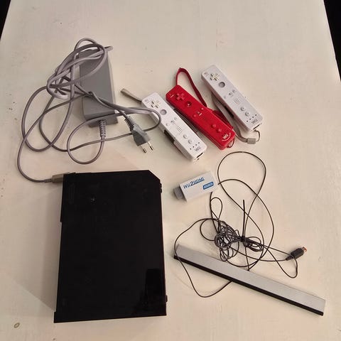 Nintendo Wii i mycket bra skick. Förutom konsoll med sladdar och två kontroller ingår även en nunchuck, kartong till en kontroll, två gummiskydd och en massa manualer samt spelen Mario Kart Wii och en svart + två vita rattar, Just Dance (3, 2016, 2017, 2018 och 2019), Super Mario Galaxy 1 och 2, Mario Party 9, Wii Sports Resort, Super Smash Bros Brawl, New Super Mario Bros Wii och The Legend of Zelda: Twilight Princess.