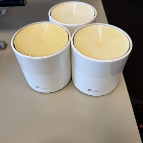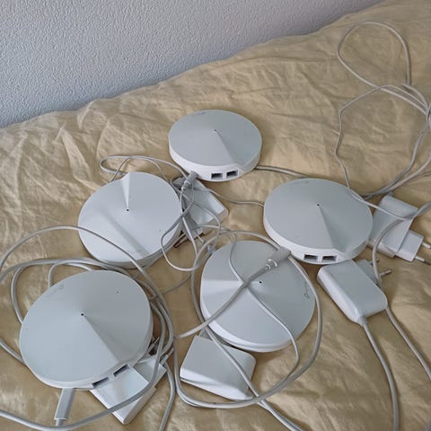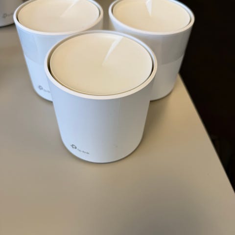 TP-Link Deco router i vitt utförande. Systemet består av tre runda enheter med tillhörande kablar och nätadapter, avsett för trådlöst nätverk i hem eller mindre kontor. Routrarna är utformade för att placeras på plana ytor inomhus och ansluts via nätverkskabel till befintligt modem eller nätverk.