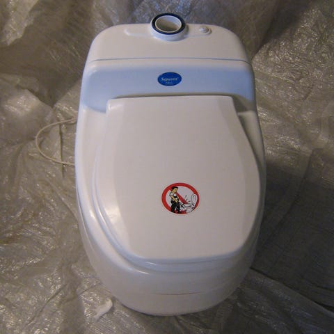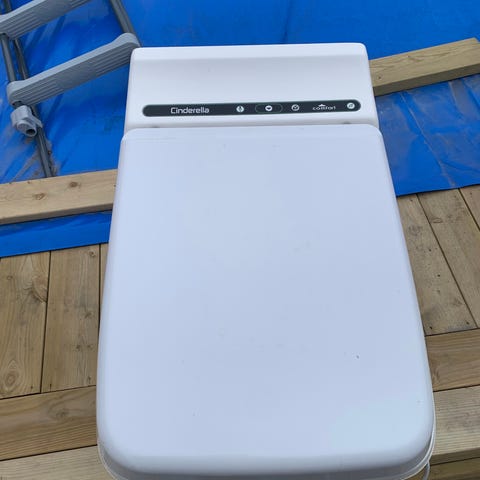 Cinderella förbränningstoalett i vit färg. Toaletten är elansluten och har lock med tydliga symboler för användning. Enheten har anslutningar på baksidan för ventilation och avluftning. Lämplig för exempelvis fritidshus, stuga eller andra platser utan traditionellt avlopp, där avfall förbränns i toaletten i stället för att ledas till avloppssystem.