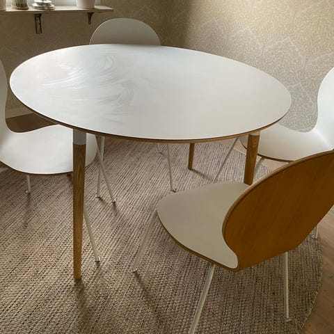 Matgrupp för 4 personer, runt vitt bord med trä ben samt 4 stolar till.