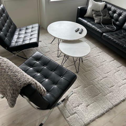 Rektangulär matta i beige och grå toner med diskret mönster. Den är en modern inredningsdetalj som passar under soffgrupp eller soffbord i vardagsrum. Färgsättningen går i ljusa neutrala nyanser som gör att mattan fungerar i många typer av inredningar. Storleken är anpassad för att rymma ett soffbord med sittgrupp runtom