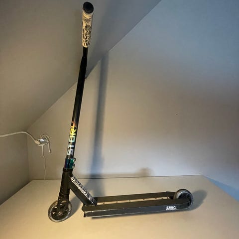 Stuntkickbike i svart och vitt utförande. Modellen har T-format styre med grepp, kompakt deck och små hjul anpassade för tricks och åkning i skatepark eller på plana underlag. Passar för barn eller ungdomar som vill åka kickbike och öva enklare trick. Ingen justerbar höjd på styret syns på bilderna. Perfekt nu för sommaren, köpt ny för 2950kr. Säljer för den inte kommer till användning längre