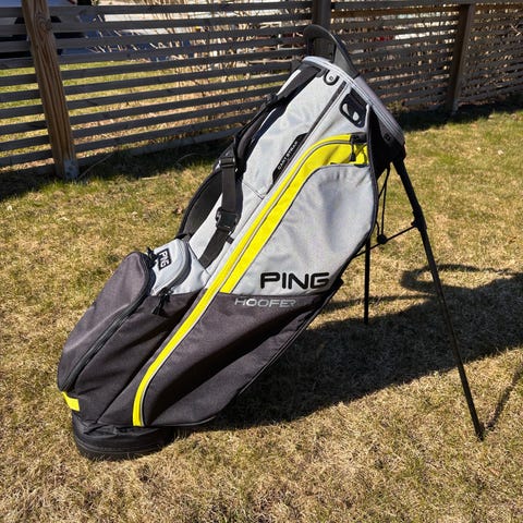 Golfbag, normalt beg skick, helt ok - förutom HANDTAGET, lilla bärhandtaget, gått av ena "fästet". se bilder. Får bära med axelremmarna. Annars helt ok, enkel, lätt bag. Hämtas Pålsjö Östra, Helsingborg.