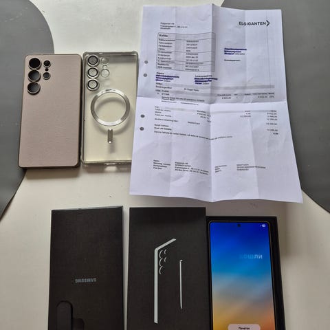 Samsung Galaxy S24 mobiltelefon med 128 GB internminne. Samsungs guldfärg. På bilderna syns även originalkartong, snabbstartsguide samt två magsafe mobilskal. Lämplig som vardagstelefon med gott om lagringsutrymme för appar, bilder och video. Absolut nyskick.