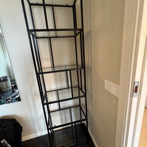 Säljer en stilren och dekorativ hylla i svart metall med glasskivor perfekt för att visa upp dina favoritprylar.