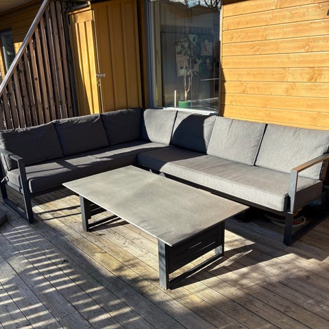 Utemöbelgrupp bestående av två soffor, två fåtöljer och ett lågt bord. Stommar i mörkgrå metall med raka linjer. Sitt- och ryggdynor i ljus textil, avtagbar och tvättbar klädsel.