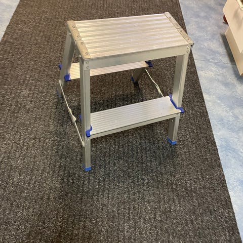 Stegpall i metall med hjul. Pallen är cylindrisk med två steg och har vit lackerad yta med mörk ovansida. Undersidan är utrustad med fyra hjul för enkel förflyttning. Finns cirka 10 st 100kr styck 800 för alla
