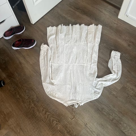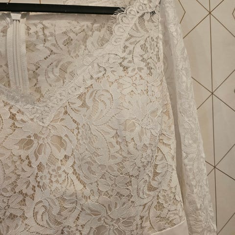 Ny Oanvända Creme färg klänning(som silken material), 85cm lång + 10cm lång brodierier/spets och axelband stl. 14 (38)