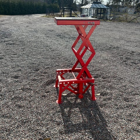 MC-lyft med hydraulisk funktion och angiven kapacitet 680 kg. Konstruktion i metall med blå lack och svarta gummibelagda körbanor för stabilt stöd av motorcykel eller liknande fordon. Utrustad med hjul för att kunna rullas och positioneras samt mekaniska låspunkter i olika höjdlägen. Lämplig för lyft och servicearbeten på motorcyklar inom verkstad eller garage.