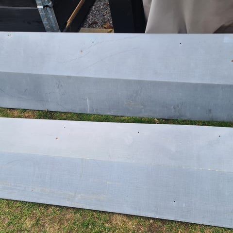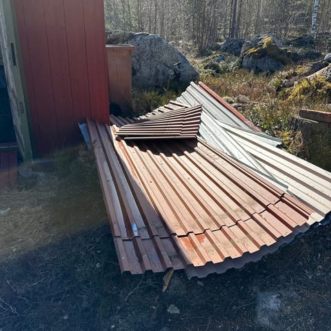 Det är en stor skiva som kapades i två men resultat blev inte som tänkt och därmed behövs den inte. Plåten är något böjd och ojämn där den blev kapad men i övrigt inga konstigheter. Den som har rätt verktyg kan nog kapa bort det för att sen använda plåtarken till annat. :)