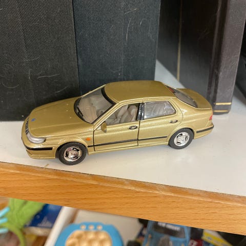 Saab modellbil i grön färg. Bilen föreställer en klassisk Saab-modell med detaljerad front, strålkastare och registreringsskylt med Saab-logotyp. Passar som samlarföremål eller prydnad. Bra skick,