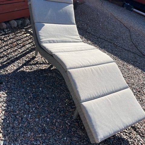 Finns i Västerås. Solstol i hopfällbar modell för utomhusbruk. Stolen har svart sits och rygg i textilene-liknande nätväv samt stomme i metall. Ryggdelen är ställbar i flera lägen. Passar på altan, balkong eller i trädgård som vilstol eller solsäng.