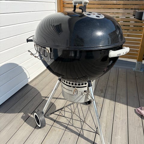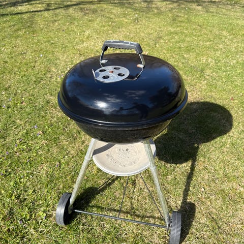 Klassisk kolgrill från Weber med rund grillkropp, lock med ventil och handtag i trä. Grillgaller i metall och askfat under grillen. Passar för kol- eller brikettgrillning utomhus på exempelvis altan eller uteplats.