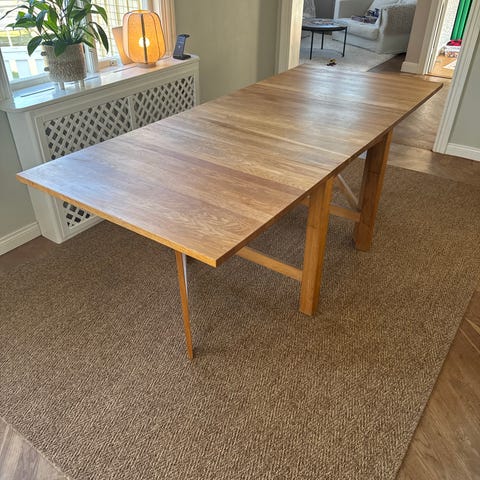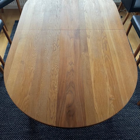 Säljer vårt fina långa matbord, som gör att alla får plats.
