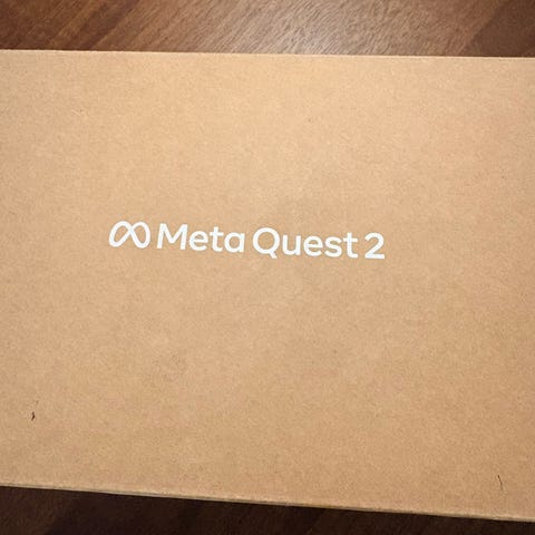 Meta Quest 2 spelkonsol VR-headset i vit färg. Paketet innehåller VR-headset med justerbart huvudband samt två handkontroller. Systemet är en fristående VR-konsol som kan användas för spel och andra VR-upplevelser. Laddkabel och originalförpackning framgår på bilderna. Passar för användare som vill ha ett trådlöst VR-headset med rörelsekontroller.