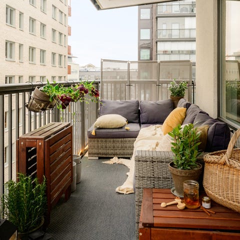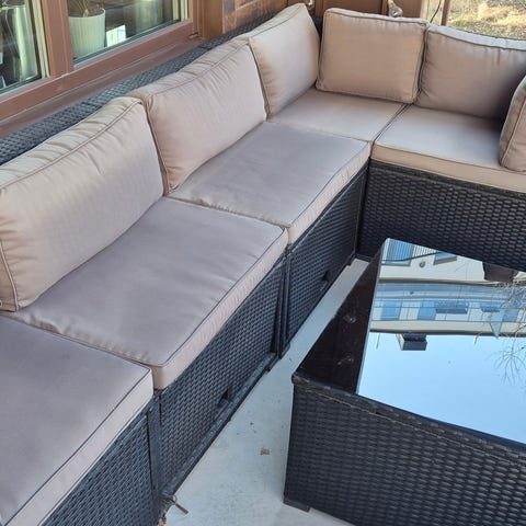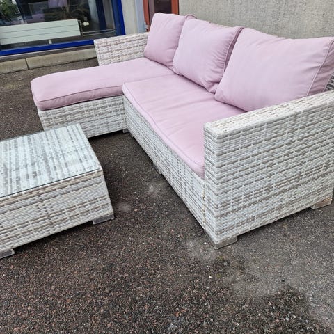 Loungeset i konstrotting med tillhörande soffbord. Möbelgruppen består av en hörnsoffa med schäslong samt ett bord med glasskiva. Passar för användning på balkong, altan eller uteplats.