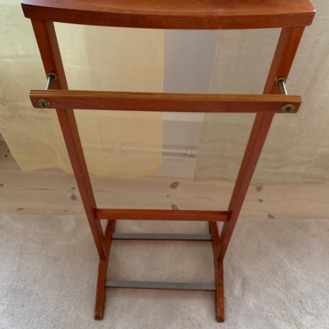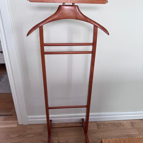 Mio exklusiv klädhängare herrbetjänt i ek med detaljer i metall. Övre del formad som galge för upphängning av kavaj, skjorta eller jacka. Nedre stänger i metall för byxor eller andra plagg. Fristående konstruktion som kan placeras i sovrum, hall eller klädkammare för förvaring och vädring av kläder.