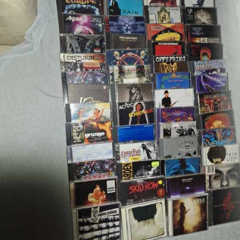 Samling med CD-skivor från blandade artister inom hårdrock och metal. På bilden syns bland annat album med Judas Priest, Van Halen och flera andra band. Fodral och skivor varierar i utförande enligt bilden. Lämpligt för den som vill utöka sin samling av rock- och metalmusik