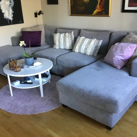 Mio hörnsoffa i mörkgrått tyg. Soffan har flera sittplatser och schäslongdel, med raka linjer och lösa ryggkuddar. Passar som större sofflösning i vardagsrum och är utformad för placering i hörn eller längs två väggar.