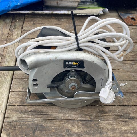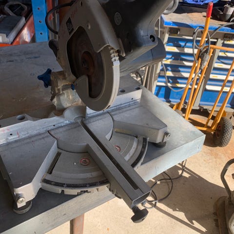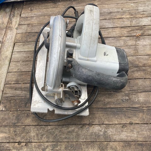 Cirkelsåg med stativ. Sågen är monterad på ett fristående stativ som ger stabilitet vid arbete. Sågen har justerbart anhåll och handtag för säker styrning av materialet vid sågning.