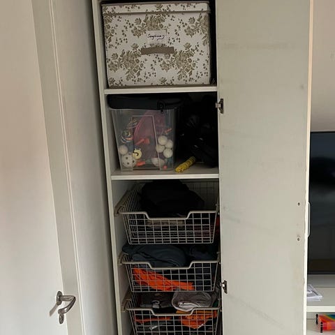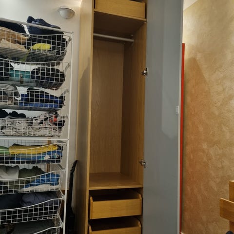 Garderob med röd dörr från Ikea. Inredningen på bilden ingår