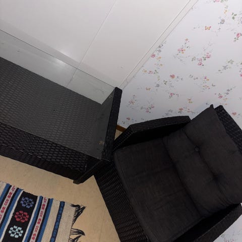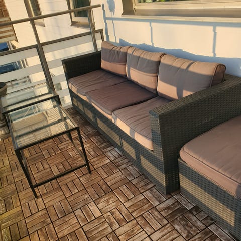 Loungeset utemöbler i brun konstrotting med beige sitt- och ryggdynor. Setet består av en tresitssoffa, två fåtöljer och ett rektangulärt soffbord med glasskiva ovanpå konstrottingunderrede. Möblerna är avsedda för uteplats, altan eller uterum och erbjuder sittplatser för flera personer. Dynorna är lösa och kan tas av från sits och ryggstöd. På bordet har rottingen gått sönder på ett par ställen