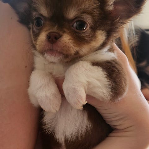 En underbar glad liten chihuahua tik. extremt lättlärd, gosig älskar att ligga nära i knä och i säng, Rumsren, går även på kisskydd. Gillar att sova länge på morgonen.