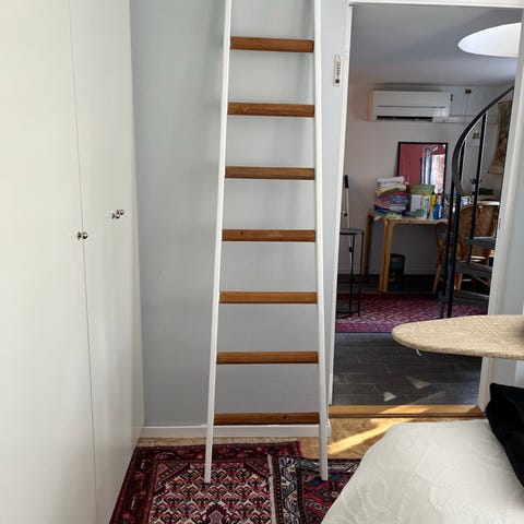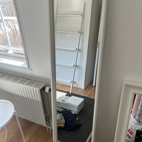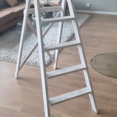 IKEA stege i vitmålat trä. Stegen har fyra runda steg och en rak, smal konstruktion som lämpar sig för exempelvis loftsäng, förvaring eller som inredningsdetalj. Färg och utförande gör att den passar in i många olika rum och inredningsstilar. Används för tillfället som handdukshängare