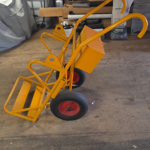Gasskåp med svetsutrustning och gasflaskor. Utrustningen omfattar ett orange träskåp märkt med varningsskylt för gas, regulatorer med manometrar, slangar, flera svets- och skärmunstycken samt två gasflaskor monterade inuti skåpet. Behöver lite översyn och byte av div slangar ock koll av regulatorer och manometrar. Ej använd på några år