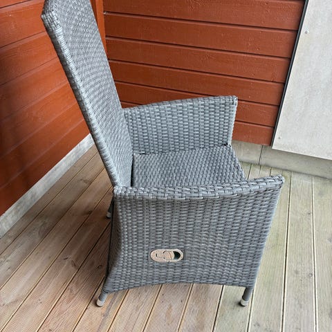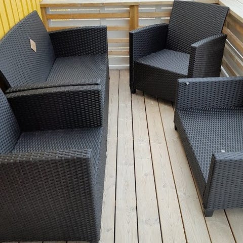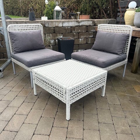 Trädgårdsgrupp i konstrotting bestående av flera fristående fåtöljer och låga bord.