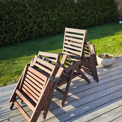 Två solstolar / trädgårdsstolar i trä, dyra i inköp och knappt använda. Dock har limmet torkat ut så ena behöver limmas lite nedtill, där jag visar bild på sista fotot.