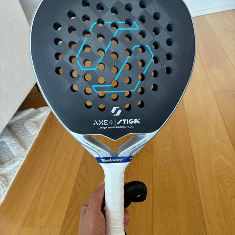 Siux Diablo padelracket i kolfiber med silverfärgad slagyta och svart grepp. Racketet har perforerad träffyta med rutmönstrad kolfiberstruktur och detaljer i svart och blått. Passar för padelspelare som vill ha ett racket med kolfiberkonstruktion och rundad form för spel på padelbana inomhus eller utomhus.
