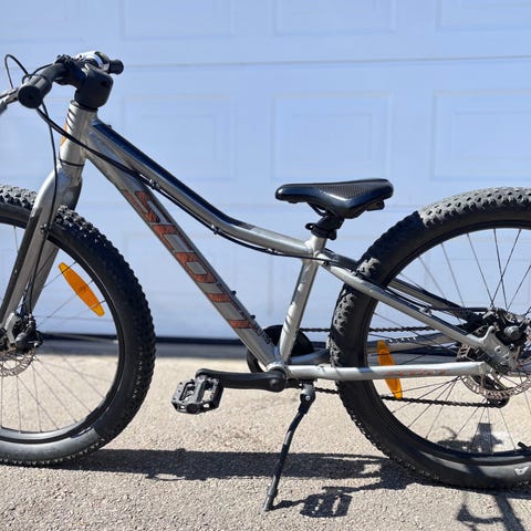 Cykeln har en hård framgaffel, skivbromsar och grovmönstrade däck anpassade för cykling på både grus och enklare stigar.