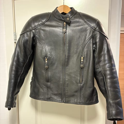 1. Helt ny mc-jacka i nötskinn, herr 46 S. Löstagbar ryggplatta, axelskydd samt armbågsskydd, alla CE-märkta. Perforerat skinn framtill på bröstet samt baktill på ryggen. Insidan av ärmarna består delvis av tyg, för ökad luftgenomströmning och flexibilitet. Löstagbart foder. Två medelstora fickor på framsidan, inga innerfickor. Blixtlås och tryckknapp i ärmsluten. 750 kr (original 2079).