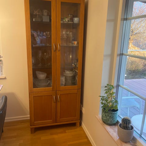 Säljer mitt vitrinskåp från ikea. Belysning ingår i priset.