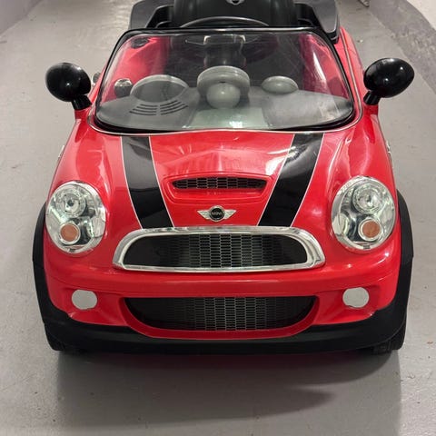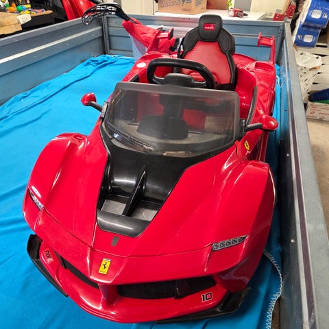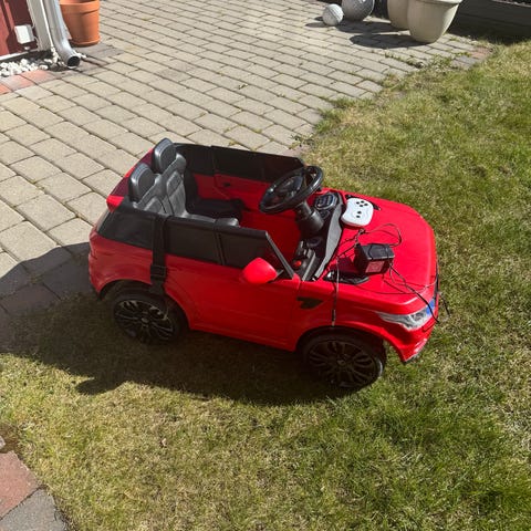 Audi elbil leksaksbil i röd färg. Modellen är utformad som en sportbil med två sitsar, ratt med Audi-logotyp och instrumentpanel i plast. Bilen har svarta säten och svarta hjul. Avsedd som eldriven leksaksbil för barn att sitta i och köra på plana underlag, exempelvis garageuppfart eller gårdsplan. Drivs med uppladdningsbart batteri (batteri och laddare kan behöva kontrolleras separat).