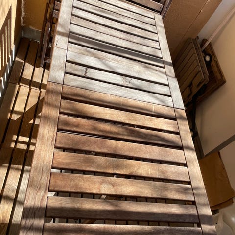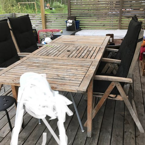 Utebord med tillhörande stolar i ädelträ i brun nyans. Extraskiva/iläggskiva förlänger bordet och skapar två extra sittplatser och plats för parasoll (parasoll ingår ej). Till bordet hör sex stolar med ribbad rygg och sits. Möblerna är avsedda för utomhusbruk på altan, balkong eller i trädgård. Bordets bredd 100 cm, längd 170 cm, 60 cm extra med iläggskiva.