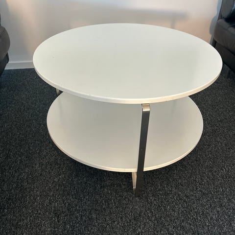 Runt soffbord med vit metallstomme och glasskiva. Bordet har en rund vit hylla undertill för extra förvaring eller dekoration. Passar som soffbord eller sidobord i vardagsrum eller annan sällskapsyta.