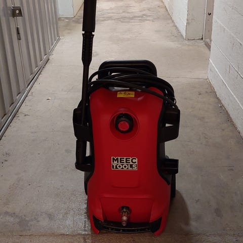 Meec Tools kompressor i röd färg med monterad blå luftslang. Kompressorn är utrustad med hjul och handtag för enklare förflyttning samt tryckmätare och reglage för inställning av lufttryck. Passar för tryckluftsverktyg, pumpning av däck och andra enklare tryckluftsarbeten i garage eller hobbyverkstad.