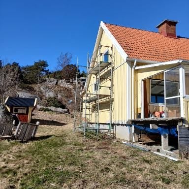 Säljer nu min byggställning då jag inte ska bygga till mer på sommarstugan. Följande artiklar ingår i försäljningen: Se bild med innehåll. Diverse krokar, fästen för att fästa den mot fasad finns.