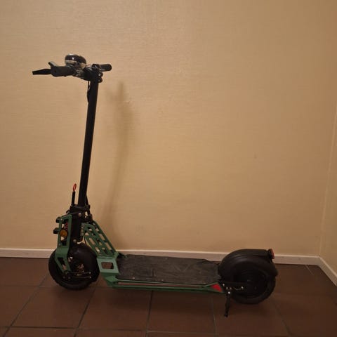 Kugoo el‑sparkcykel i svart och orange färg. Modellen har ett brett fotstöd och grovmönstrade däck anpassade för stadskörning och enklare ojämnt underlag. På styret finns en digital display som visar hastighet, batterinivå och körläge. Sparkcykeln är utrustad med framljus och blinkande ljuslist framtill för ökad synlighet. El‑sparkcykeln lämpar sig för kortare och medellånga transporter i urbana miljöer.