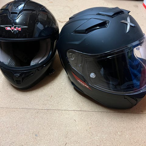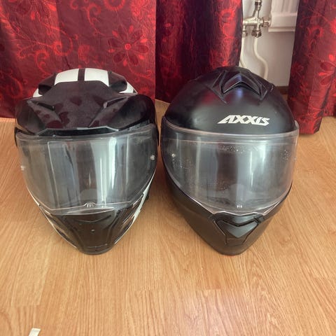 2 begagnade mc-hjälmar (S & M). Den vita är i mycket bra skick, den svarta har några skavanker som syns på bilderna.