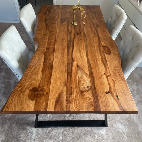 Bord i robust massiv ek, delad skiva. Underrede i svart metall.