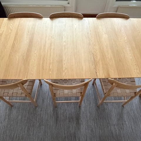 Matgrupp med bord och 6st stolar samt tillhörande tilläggskiva.