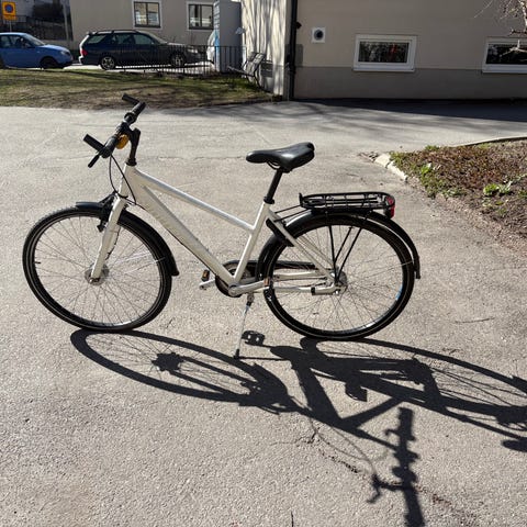 Crescent hybridcykel för unisex med ramstorlek 51 cm och hjulstorlek 28"/700c. Cykeln har låg instegsram, raka styren och pakethållare bak. Utrustad med skärmar fram och bak samt standard sadel och pedaler. Passar för vardagscykling och pendling på blandat underlag i stad och förort.